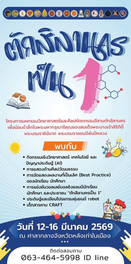 โครงการมหกรรมวิทยาศาสตร์และศิลปหัตถกรรมอีสานตักศิลาลานคร (ตักศิลานครเป็น 1) วันที่ 12-16 มีนาคม 2569 ณ ที่ว่าการอำเภอเมืองมหาสารคาม (ศาลากลางจังหวัดหลังเก่าในเมือง)